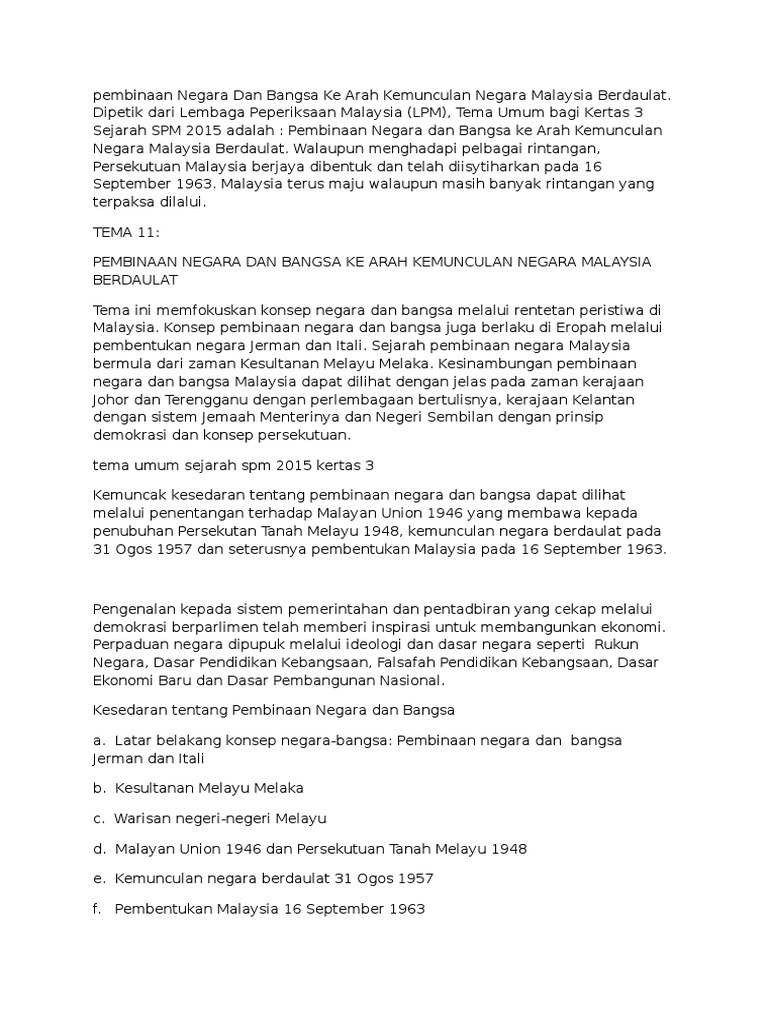 Related : Kertas 3 Sejarah Kesedaran Pembinaan Negara Dan Bangsa / Tema/tajuk:11.1 pembinaan negara dan bangsa malaysia soalan:pengenalan malayan union di tanah melayu 1946 telah membangkitkan penentanga..