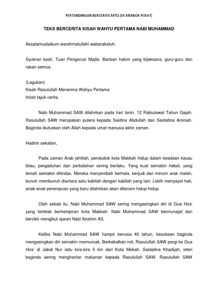 2 Teks Dugaan N Yusuf from image.slidesharecdn.com Pertandingan bercerita lelaki kisah nabi mtq2019 sekolah rendah peringkat negeri jpnwpkl sk pengkalan tentera darat. Pertandingan bercerita perempuan kisah nabi mtq2019 sekolah rendah peringkat negeri jpnwpkl sk pengkalan tentera. Anas diberikan oleh orang tuanya kepada nabi muhammad. Nabi muhammad saw merupakan anak kepada abdullah dan ibunya bernama aminah. Biasanya tujuan teks ini sesuai untuk acara pertandingan bercerita iaitu aktiviti sekolah ataupun sekadar aktiviti dalam kelas. Kejadian itu bermula ketika muhammad sangat prihatin akan keruntuhan moral yang sangat mengkhawatirkan di makkah. Teks bercerita tahap 1 sekolah rendah 2017. Dari kisah para nabi dan rasul, kita bisa belajar bagaimana menyikapi segala permasalahan yang ada di dalam kehidupan dan bagaimana bersikap dengan sesama.