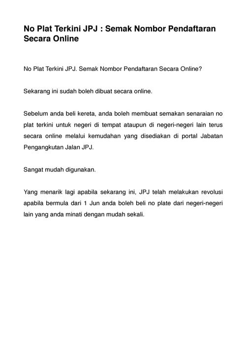 Semak nombor plat terkini 2018 secara online. Nombor plat atau nombor pendaftaran kenderaan boleh disemak secara online. Cara semakan nombor plate terkini 2021. Semakan senarai no plat terkini dan nombor plate yang belum didaftar, pendaftaran jpj number plate running terkini setiap negeri di malaysia 2021. Terkenal dengan slogan 'uitm di hatiku' pastinya no plat kenderaan ini boleh menjadi kenangan disamping dekat dihati mereka.