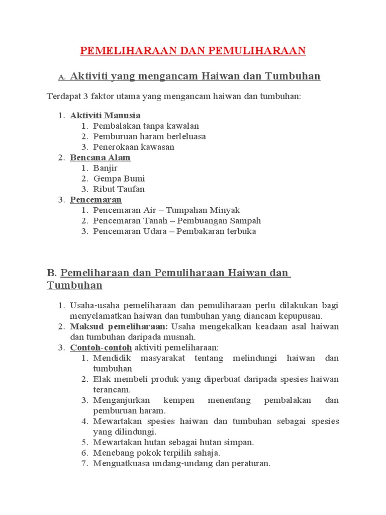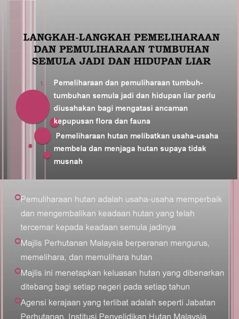 Mengembalikan haiwan dan tumbuhan kepada asal supaya dapat dinikmati oleh generasi akan datang. Pemeliharaan dan pemuliharaan tahun 6 (slide lecture)подробнее. Savesave pemeliharaan dan pemuliharaan haiwan dan tumbuhan for later. Mengelakkan kepupusan flora dan fauna. Membahayakan penduduk jika haiwan yang kehilangan tempat perlindungan akan menyerang pemuliharaan.